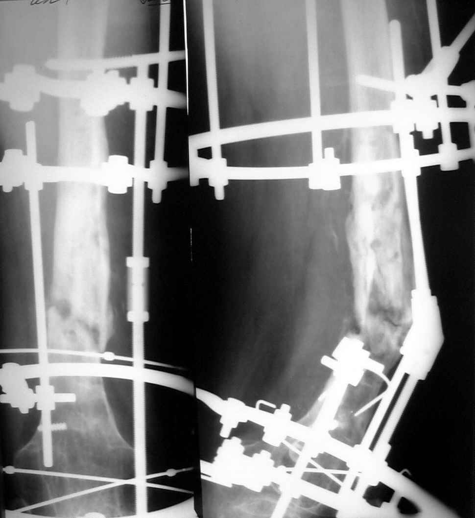 Если инфекция присутствует (вполне возможно, судя по рентгенограмме), резекция инфицированной, некротизированной кости, замещение образовавшегося дефекта с помощью транспорта костного блока в аппарате.