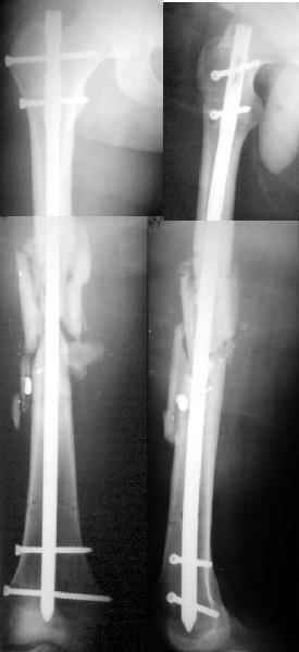 За 3 мес перелом бедра должен бы срастаться, а судя по рентгенограмме признаков консолидации не видно, кроме того уже проблема с подвижностью в