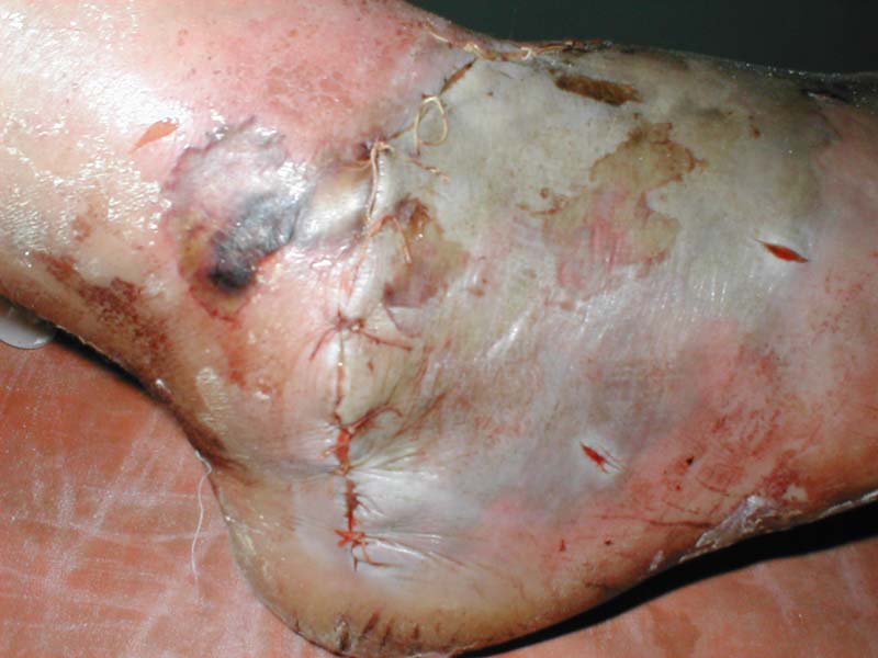 пластика свободным кожным лоскутом, антибактериальная Терапия, гепарин, иммобилиза-ция (в аппарате или в лонгетной повязке). При такой травме принципиален момент положе-ния стопы - не стоит придавать возвышенное положение - усугубляет нарушение перфузии, стопа должна находиться в горизонтальной плоскости. Можно пойти и по другому , выжида-тельному пути - ждать когда окончательно наступит формирование зоны демеркации и то-гда уже выполнить некрэктомию. На мой взгляд, при выжидательной тактике повышается риск развитя вторичной раневой инфекции, что создает дополнительные проблемы (Е.Чекашкин, врач ортопед-травматолог, Российская Федерация)