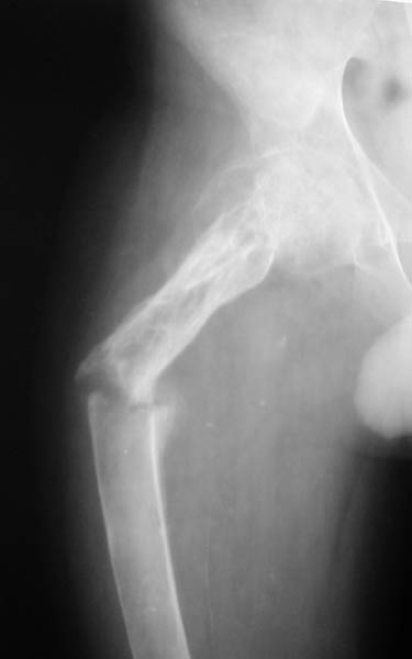 Возможно у мальчика имела место фиброзная дисплазия проксимального отдела бедренной кости, но это в прошлом. В настоящее время необходима замена проксимального отдела бедра на ревизионный или онкологический эндопротез ТБС. Значительный опыт лечения детей методом