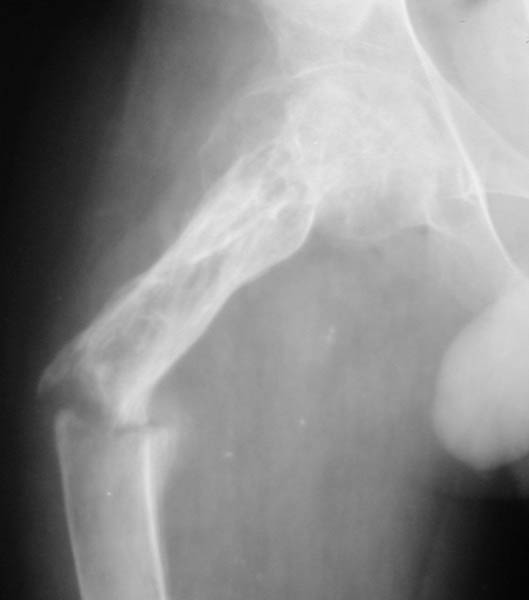 Мальчик, 14 летЖалобы на боли в правом бедре, резкое ограничение активных и пассивных движений в тазобедренном и коленном суставах справа, вынужденное положение правой ноги. Диагноз: Хондрома проксимального отдела правого бедра, состояние после внутриполостной резекции и аллопластики, закрытый патологический перелом проксимального отдела правого бедра со смещением В 2001 г. - хондрома проксимального отдела правого бедра. Операция - внутриполостная резекция, аллопластика. В течение 2 лет - 2 патологических перелома (СВ, гипс). 23.04. - закрытый патологический перелом проксимального отдела правого бедра.Патогистологическое исследование от 06.05.: остеобластома, диагноз в пользу агрессивного варианта.Тактика лечения?С уважением,А.В.ВладзимирскийДонецкий НИИ травматологии и ортопедииДонецк, Украина