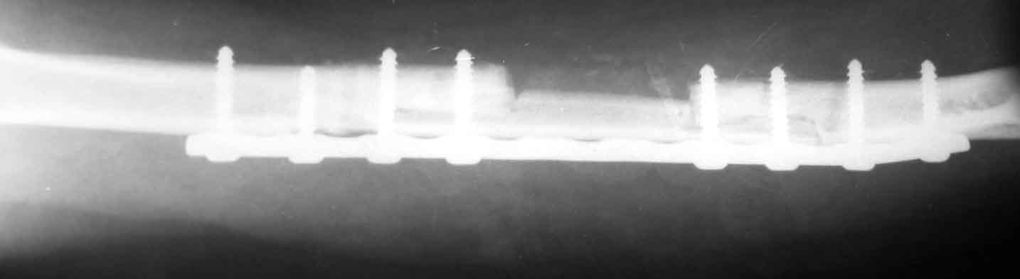 Твоя концепция стабилизации отломков, своего рода *протезирования* лучевой кости продемонстрирована на Ргграммах. Прямого кость-кость контакта между дистальным и промежуточным фрагментами не получилось, что может скомпрометировать сращение перелома, хотя при первично стабильной фиксации и сохраненной надкостнице можно рассчитывать не
