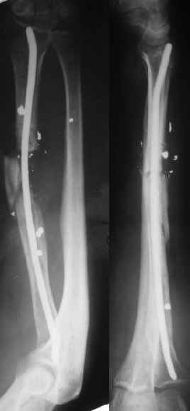 И все-таки, для интрамемедуллярного стержня во вращающейся лучевой кости потребуется длительная внешняя фиксация. Идти заведомо на "эндопротезирование" лучевой кости, на несращение -- стоило ли огород городить?