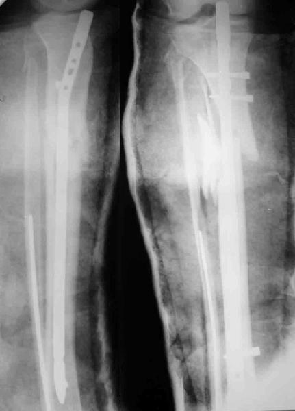 Предлагались разные варианты (коррекция на имеющемся фиксаторе, удаление гвоздя и остеосинтез пластиной, чрескостный остеосинтез...) Выбран был вариант с удалением гвоздя и накостным остеосинтезом. Прошло полгода, больная начала частично нагружать оперированную конечность, будучи в пластиковом ортезе и пользуясь 2 костылями. Две недели назад появилась патологическая подвижность :-( Вчера поступила к нам в отделение. Клинически определяется приличная подвижность, градусов 35 в переднезаднем направлении. На снимках еще видны фиксированная тоникм стержнем уже сросшаяся малоберцовая кость, и тоже сросшийя перелом дистального метадиафиза большеберцовой кости без признаков хирургической фиксации (?). Сегодняшний снимок также в приложении. Планируем удаление пластинки и закрытый интрамедуллярный остеосинтез с рассверливанием. Что скажете, коллеги? Что можно/нужно было сделать, чтобы избежать сегодняшней проблемы? Есть ли другие предложения по нынешнему плану?