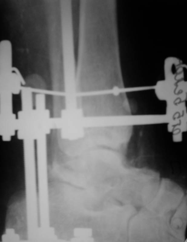 Что сделали. Под наркозом попытка закрытой ручной репозиции - безуспешно. Латеральный доступ, открытая репозиция таранной кости. Наложение АВФ (2 кольца, 2 полукольца на пятке и переднем отделе стопы). Устранение подтаранного вывиха стопы. Послеоперационные снимки в приложении.