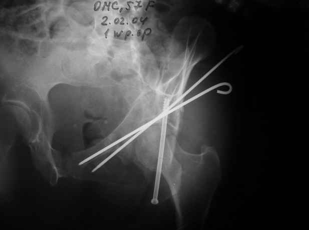 Однако есть альтернатива. Репозиция из подвздошного доступа тазовыми щипцами с разнодлинными браншами или тазовым пистолетом, а фиксация задней колонны через седалищный бугор или тазрвыми винтами 4,5 или каннюлированными 6,5 или 7,3. По-моему я посылал на ортофорум такой снимок, когда жаловался на ишемический неврит седалищного нерва через сутки после операции. Не забудь про шейку бедра - мне кажется будет хорош длинный PFN любой фирмы, какую ты найдешь, а нет так UFN + miss a nail, как это здорово делают мои земляки - Ебурбуки. Пока.
