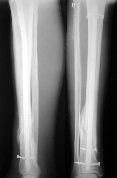 Пример, приведённый Вами в нашей дискуссии по времени нагрузки после остеосинтеза не совсем удачный... Ваш больной имеет счастье, что первым согнулся проксимальный замыкающий винт, а не дистальный и гвоздь не пенетрировал голеностопный сустав.