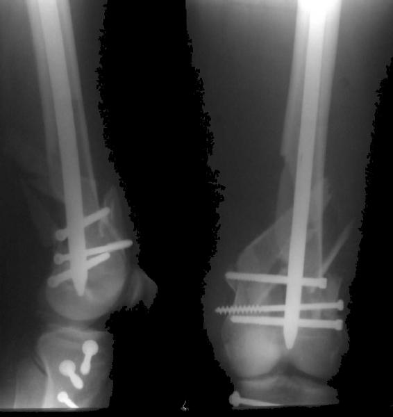 Perfect for retrograde nail + lag screw with this large a distal fragment and this much meta-diaphyseal comminution and this degree of soft tissue injury.