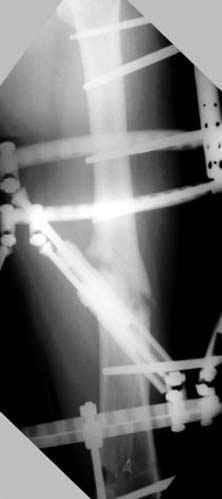 Узкий к-м канал - тонкий гвоздь- усталостный перелом дистальных винтов - развитие нестабильности и как ее результат остеолиз вокруг гвоздя - деформация анатомической оси бедра. Похоже, что я понял почему аппарат, а не новый гвоздь:-)