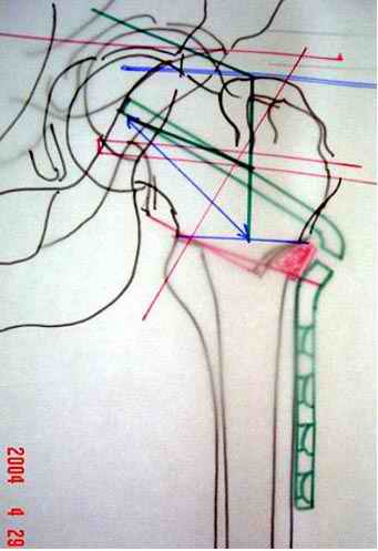 На рисунке N1 предоперационный план лечения ложного сустава шейки бедра- линия ложного сустава, угол и направление введения импланта, клиновидная остеотомия в градусах и миллиметрах, второй снимок после коррекции, расчет, на сколько удлиняется конечность и размеры импланта;