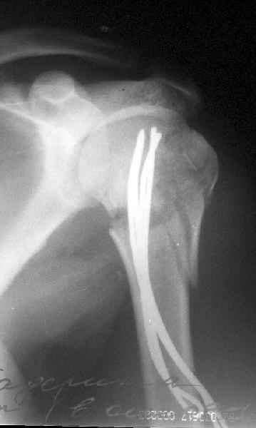 Больной находился в повязке, примерно напоминяющей косыночную, рекомендованы движения в локтевом суставе и маятниковые движения в плече, спицы удалены в три недели (были случаи миграции)