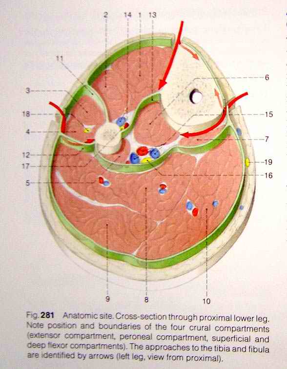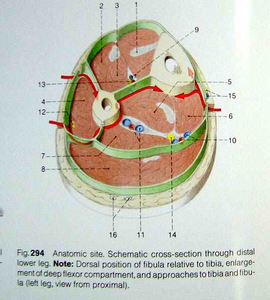 Передний - мышцы anterior tibialis, extensor digitorum longus; Наружный- мышцы pereneus longus (brevus distal anterior), Задний: поверхностное Gastrocnemus; Задний глубокий Posterior tibialis (flexor hallucus longus)