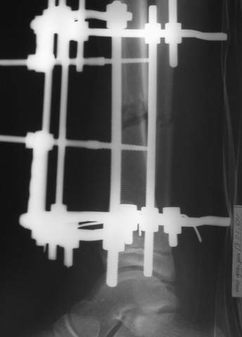 Внешняя фиксация спицевым АВФ. Можно с фиксацией пятки или три спицы в дистальном кольце.