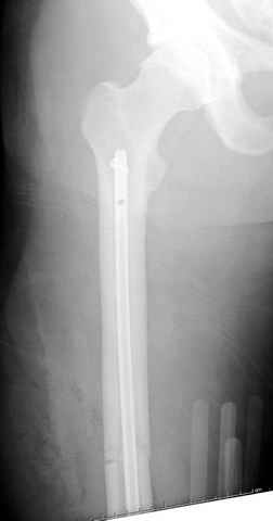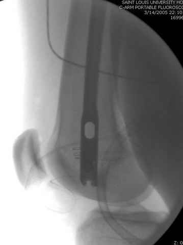 По поводу открытого перелома больной ургентно взят на ретроградное интрамедулярное штифтование, после рутинного дебрайдмента и фасциотомии на бедре и на голени.