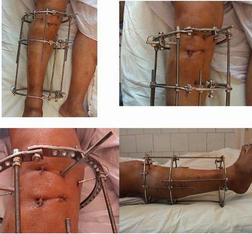 The frame I use is pretty simple, with one wire each in the proximal and distal ring, two schanz pins in the proximal ring, and one each in the middle and distal ring.