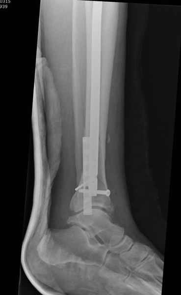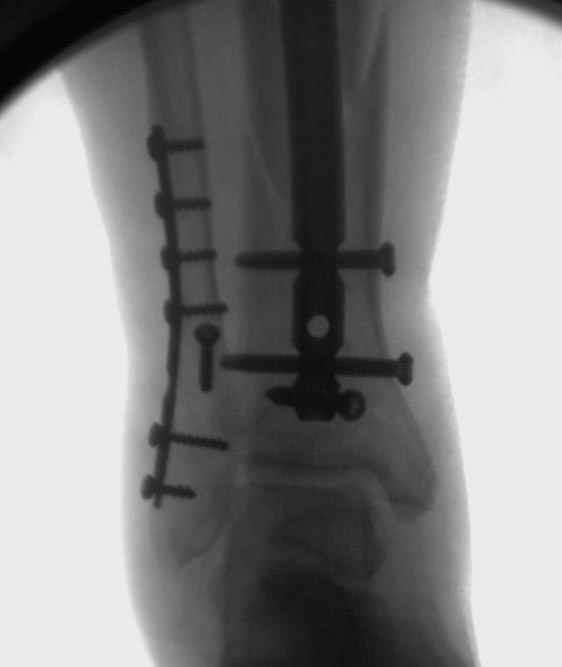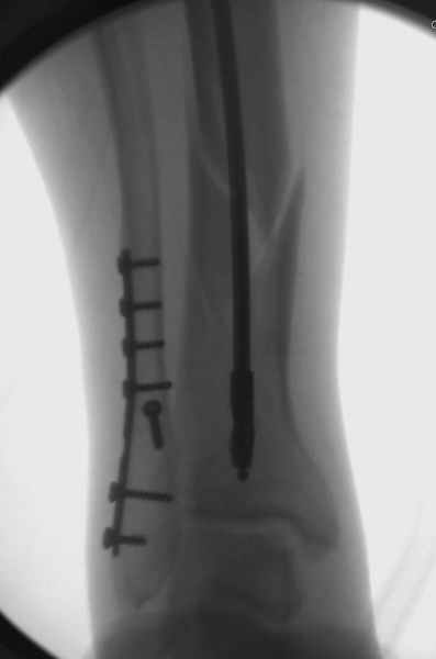 При такий спирали задний край tibia может быть сломан - нет ли этого в данном случае? На всякий случай можно было ввести 1-2 винта 4,5 мм спереди назад мимо гвоздя. Хотя самый дистальный блокирующий винт, возможно, зацепил этот отломок. А какой тут диаметр гвоздя и locking винтов?
