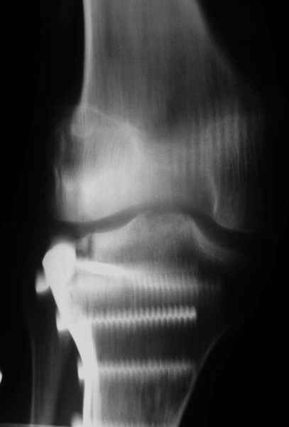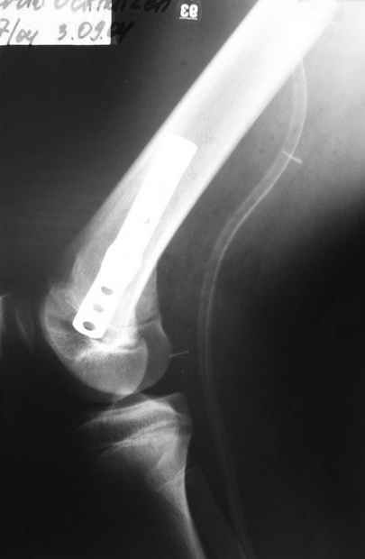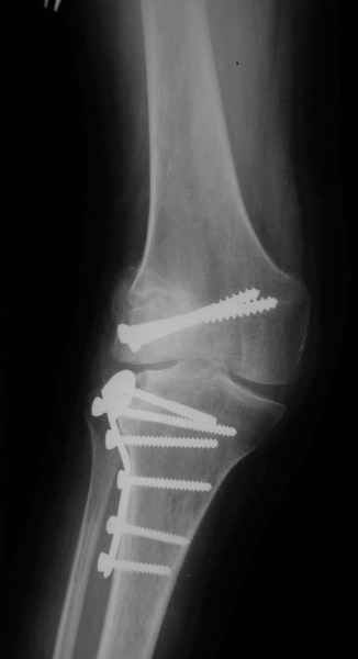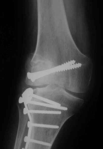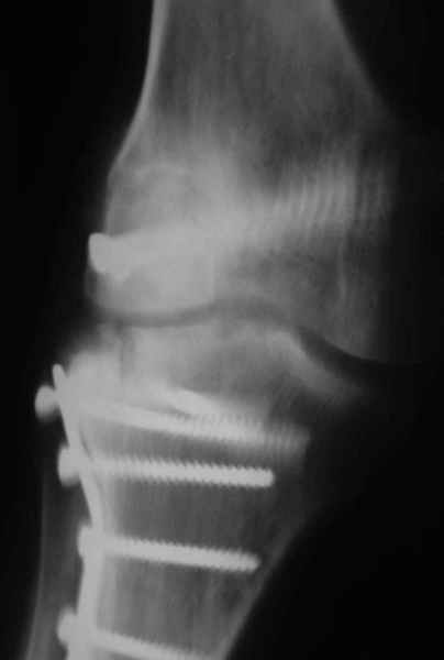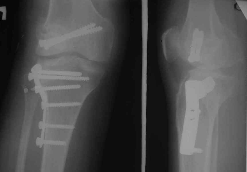 Уважаемые коллеги!На прием обратилась больная 38 лет. Травма 17.01.2005. 23.01.2005 - операция в одном из стационаров области - остеосинтез мыщелка бедра винтами, Остосинтез мыщелка большеберцовой кости L-образной пластиной.