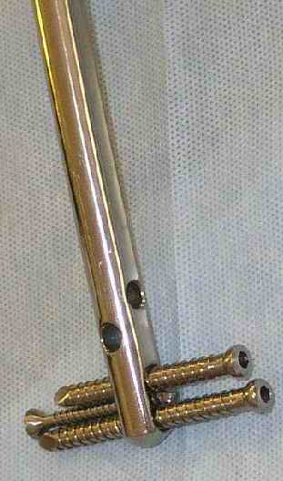 Я говорил про нашу разработку (патент на пол.модель № 49710 РФ, Универсальный интрамедуллярный гвоздь для бедренной кости / Челноков А.Н., Виноградский А.Е (РФ)), которая сейчас выпускается ФГУ "ЦИТО" (Москва, http://gep-cito.webzone.ru/ ), этот стержень уже включен в реестр разрешенных изделий. Вот так выглядит дистальный конец. Дистальное отверстие смещено максимально близко к кончику, и введение винтов даже только в него уже позволяет фиксировать очень короткий отломок.