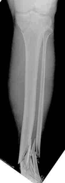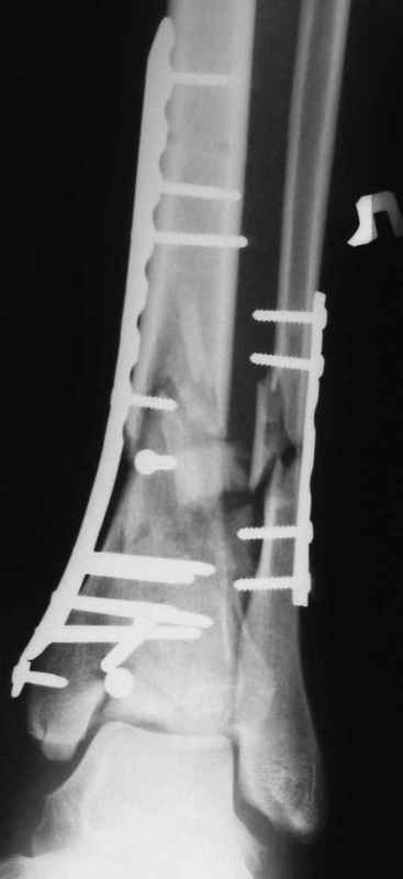 Другая комбинация, включающая открытую редукцию и фиксацию с помощью пластин перелом малоберцовой кости с наружной фиксацией перелома большеберцовой кости по данным Williams et даёт 23% инфекционных осложнений, 9% ложного сустава малоберцовой кости, 4,5% неправильно сросшихся переломов, по данным Watson et смещения метафизео-диафизарного перехода составляют 64%.