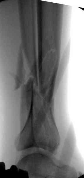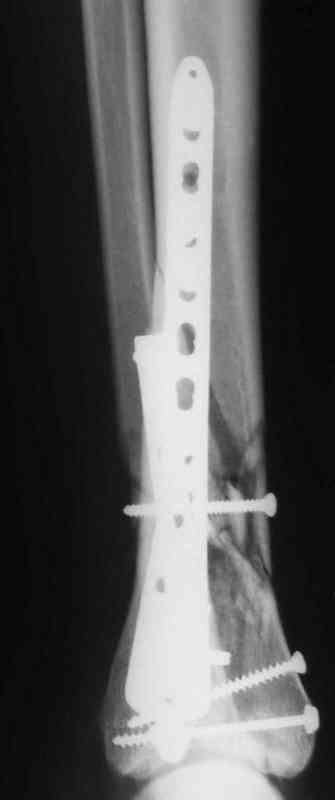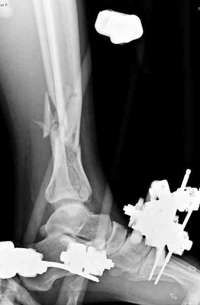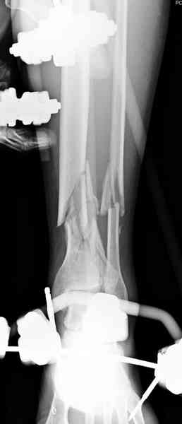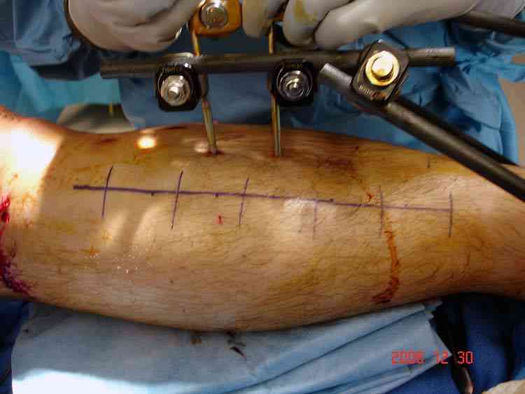 Такая отсроченная тактика окончательной репозиции вызвана тем, что при наличии тяжёлого повреждения мягких тканей, их отёк не позволяет произвести два оперативных доступа к большеберцовой и малоберцовой костям по причине невозможности закрытия одной из ран. Кроме того, фиксация голеностопного сустава в течение столь длительного периода приводит к контрактуре голеностопного сустава.