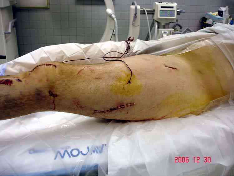 на бедре измерения не подтвердили подозрения на компартмент синдром и рана была закрыта вакуумной губкой (wound VAC).