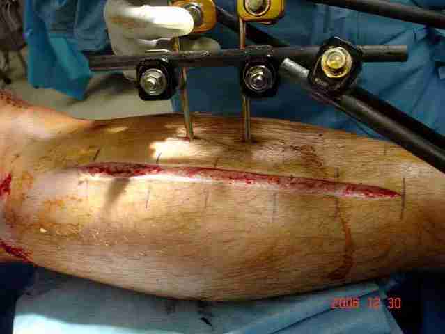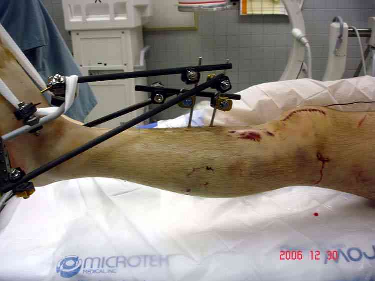 В настоящее время больной в реанимации по поводу Черепно Мозговой Травмы и состояние улучшается. Запланировал ушивание раны в пятницу, если позволит состояние мягких тканей и при отсутстви отека возможно удастся просунуть перкутанномедиальную пластину.