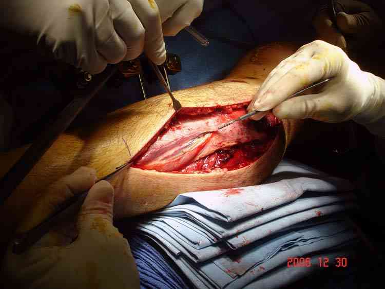 Пострадавшему 21 г., травма скоростная, после I&D с расширением раны, на бедре сделана операция ретроградным интрамедуллярным штифтом, остеосинтез с частичной резекцией надколенника и ушивание собственной связки.