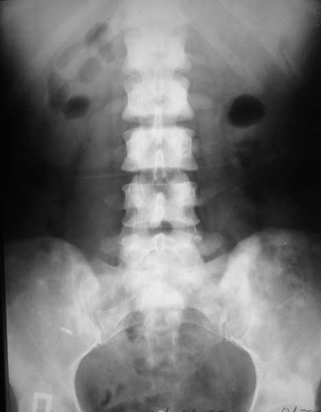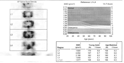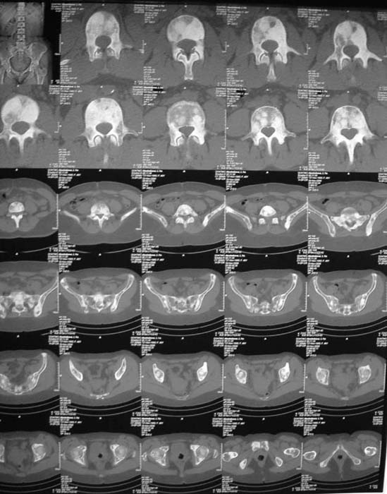 Уважаемые коллеги! Женщина, 46 лет. В течение четырех месяцев жалобы на боли в спине. В октябре 2006 г. по поводу маточного кровотечения (менопауза 4 мес.) выполнено УЗИ - гиперплазия эндометрия, полипоз. Операция - удаление полипа, выскабливание полости матки. Цитологический анализ - пласты переходного климактерического эндометрия.Проведено комплексное исследование. В приложении: рентгенограммы и томограммы поясничного отдела позвоночника; радиологические исследованиямолочной железы, ЖКТ, почек, грудной клетки, анализы.УЗИ (18.12.06.) щитовидной железы, молочных желез - без патологии (умеренный фиброз по ходу млечных протоков). Двусторонняя маммография 30.11.06. - кисты молочной железы, ФКМ. Остеосцинтиграфия 4.12.06. - активный остеобластический процесс в поясничном, нижнегрудном отделах позвоночника, костях таза.Местными онкологами онко-процесс исключен. Фтизиатрический и онкогематологический диагнозы исключены. Вопросы: 1. Диагноз? 2. Методы дополнительной диагностики? 3. Тактика лечения? С уважением, А.В.Владзимирский ДНИИТО < | >