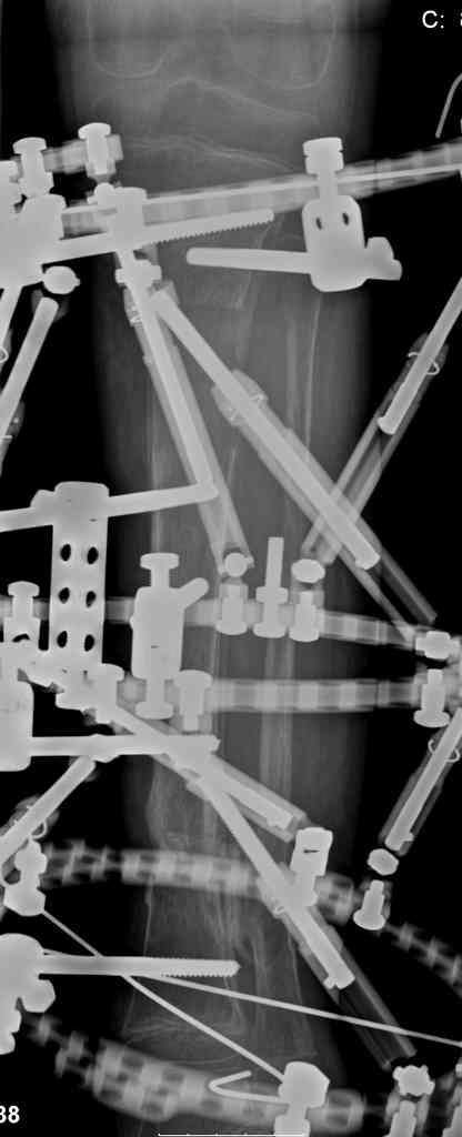 Another advantage of this techniqe is relaxation of soft tissue and possibility for closure even large defects of the skin.In your case I will apply ring on the foot and mid diaphysis of the tibia ,removal of the fibular plate,sindesmotic wire, and after correction of angulation on the proximal tibia.