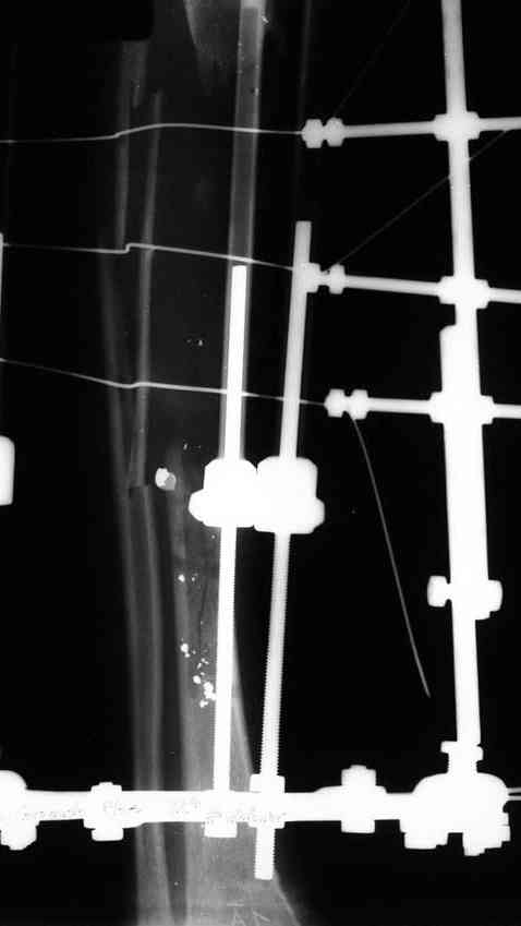 Рентген в процессе перемещения - внизу карбоновые кольца, тракция фрагмента спицами с упором.