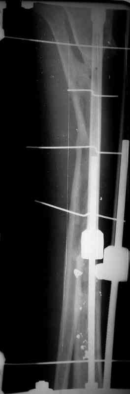 Признаюсь честно, не совсем уверен в прочности консолидации на стыке косточек. Кроме того, укорочение в районе 6 см. Сейчас реабилитация - ходит опираясь на ногу с одним костылем.