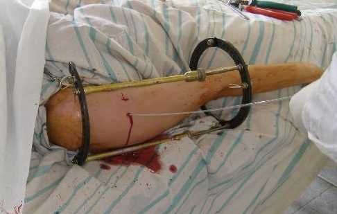 > Репозиция сделана спицевым дистрактором, проксимальная спица была
