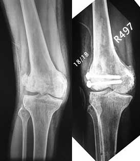 At present, he has a valgus deformity of the knee, with 0-45 degrees of movt. The knee is stable to examination, could not be corrected to neutral from the existing valgus, and despite the deformity he is walking on it, albeit with pain and some difficulty.