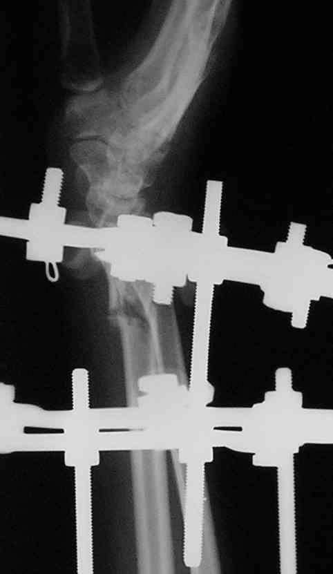 Если позволите свое мнение, не стал бы лечить аппаратом эту травму, перелом луча не консолидировался: открытая репозиция+ костная пластика+ пластина, синтез ладьевидной кости, по возможности шов ладьевидно полулунной связки,