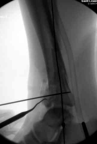 Первичная пластина или интрамедуллярный фиксатор на малоберцовую зависит от характера перелома, косые и многооскольчатые пластинами, а поперечных можно интрамедуллярными фиксаторами. Восстановленная длина малоберцовой служит ориентиром и помогает определению высоты большеберцовой во время восстановления.