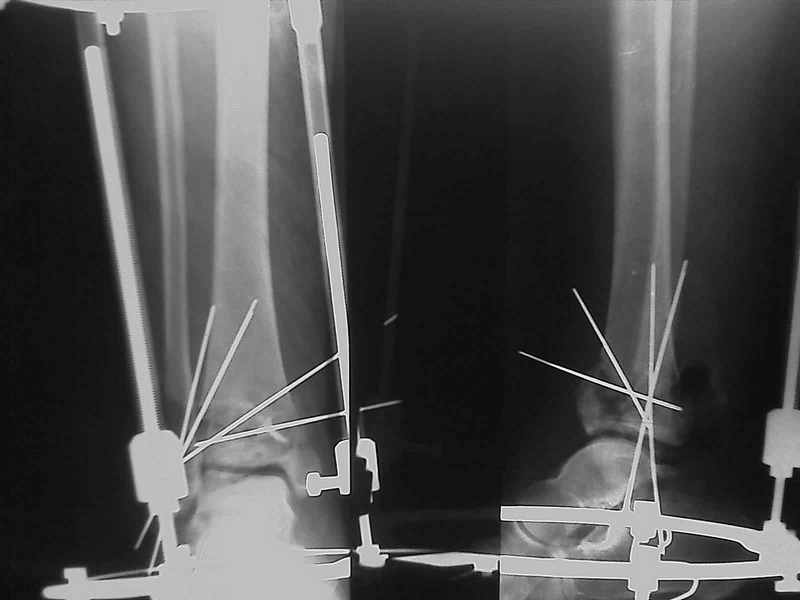 На представленных R-снимках не окончательный вид после остеосинтеза. Дистальная опора давила на стопу, пришлось ее сместить проксимально, в рез-те чего, она закрыла щель сустава, последние снимки не информативны.