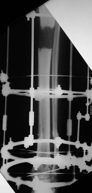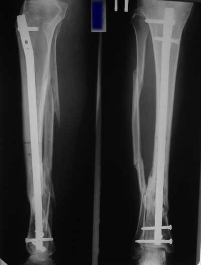 Женщина 46 лет, неудачно лечившаяся по поводу перелома голени в нижней 1\3 сначала в гипсе, поступила через 6 месяцев после остеосинтеза пластиной (рис 1). Имелась деформация в нижней 1\3 голени: варус, антекурвация, наружная ротация, два свища. Удалена пластина, дебридмент мягких тканей,
