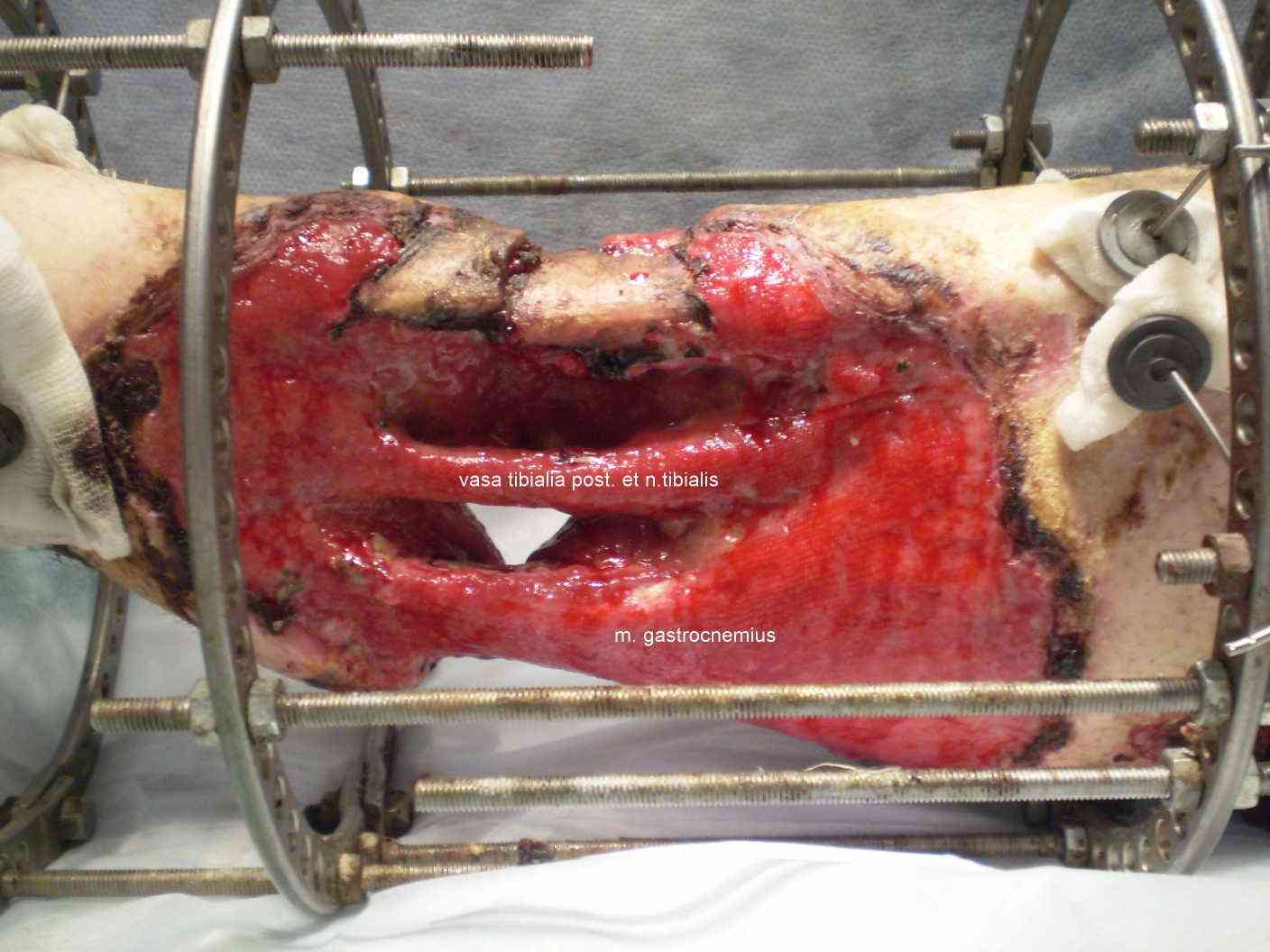 Теперь насчет представленного случая, я бы не дожидаясь самозаживления раны убрал бы мешающий фиксатор и начал бы работу над восстановлением нормального покрытия дефекта.