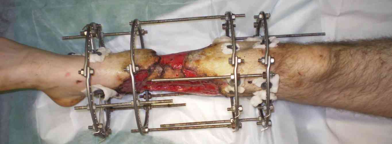 На первом этапе, не снимая системы внеочагового остеосинтеза, резецировать прилегающие в рану участки кости. Одновременно делать кожную пластику по закрытию раны. Очень важно, чтобы рана была закрыта и в проекции кости. Когда же рана полностью закроется, вторым этапом можно