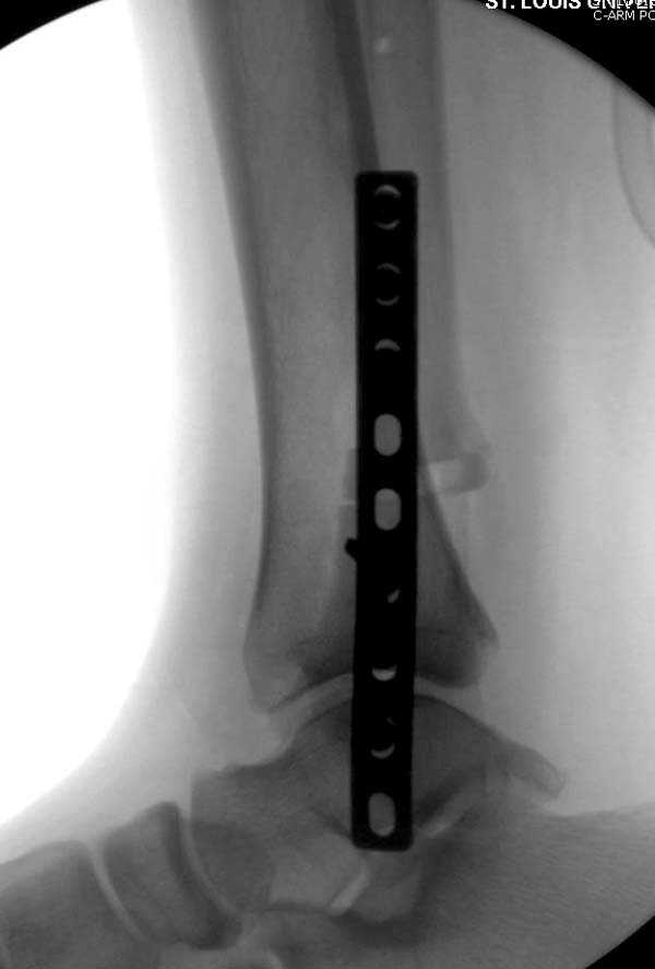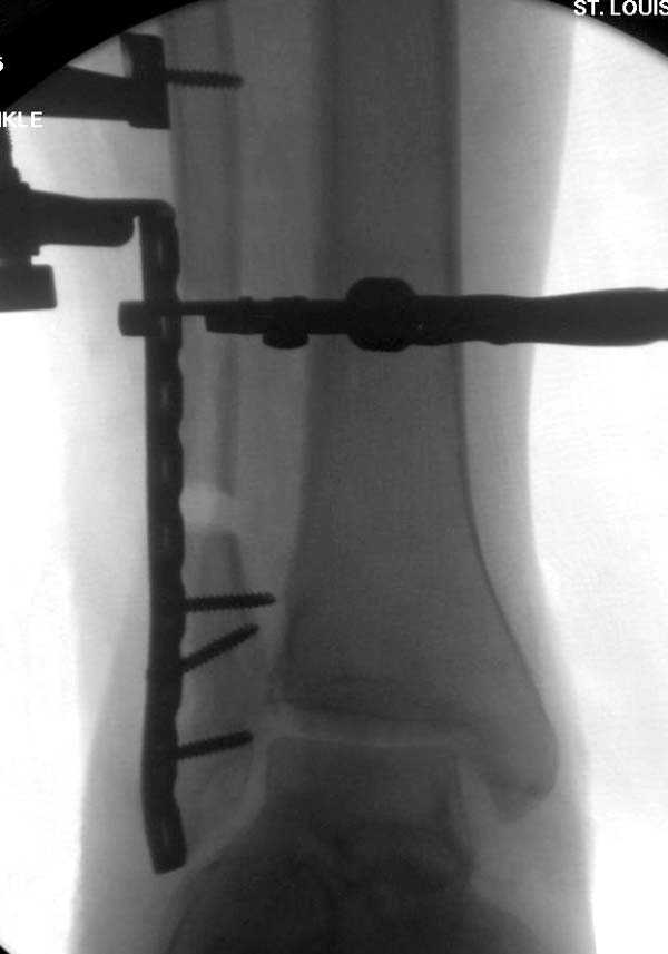 Проведена обычная стандартная процедура по исправлению неудовлетворительного состояния голеностопного сустава, где кроме удлинения малоберцовой с применением compression tension device за проксимальный конец пластины, проведено замещение трикортикальным графтом из крыла, освобождение синдесмоза и медиальной щели от