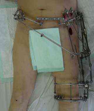 Кстати, если тазобедренный сустав безнадежно потерян, то можно по выведении длины и оси зафиксировать в аппарате дистальный отломок и только левую половину таза, освободив правую.