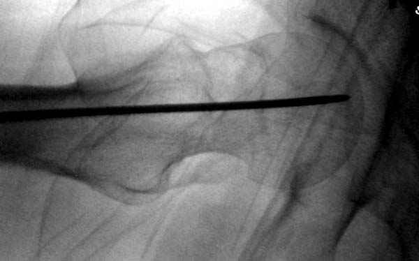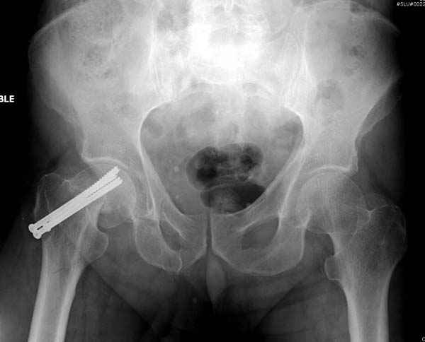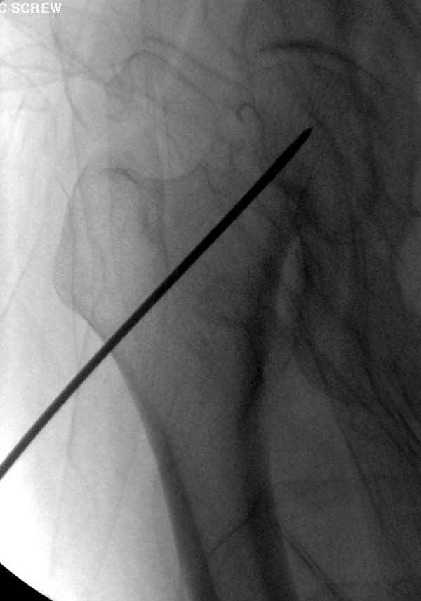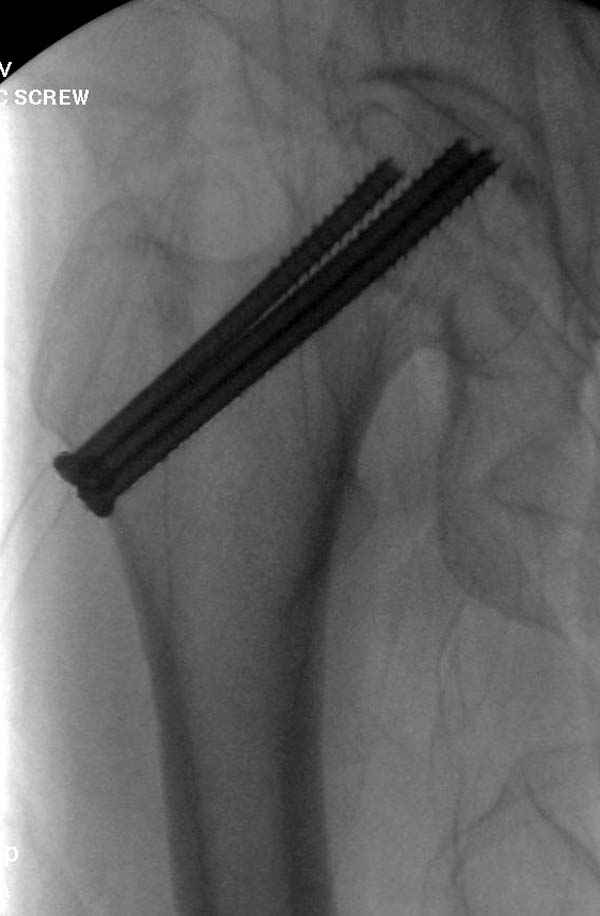 Профилактику дальнейшего раскола неполного перелома шейки провели тремя канюлированными шурупами.