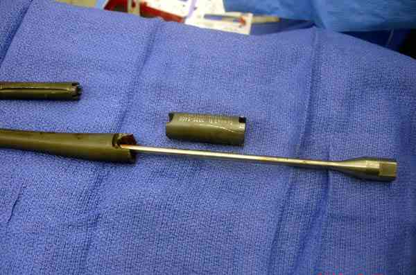 Страйкер предоставил отличный инструмент - крючок для удаления длинного гвоздя. Считаем, что врачебная ошибка по установке привела к несостоятельности импланта и к ятрогенному осложнению.