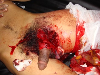 Несмотря на высокоэнергетический характер ранения, пуля не попала непосредственно в кость, а прошла рядом. Таким образом, для бедренной кости это ранение нельзя назватьв полном смысле этого слова высокоэнергетическим. К сожалению, не видно выходное отверстие. В любом случае, при таком переломе интрамедуллярный остеосинтез вполне показан. Кроме того, если пациент попал к Вам в первые часы после ранения, рана не должна рассматриваться как инфицированная. В качестве примера возможности даже более травматичной операции при таком характере перелома привожу следующий случай.