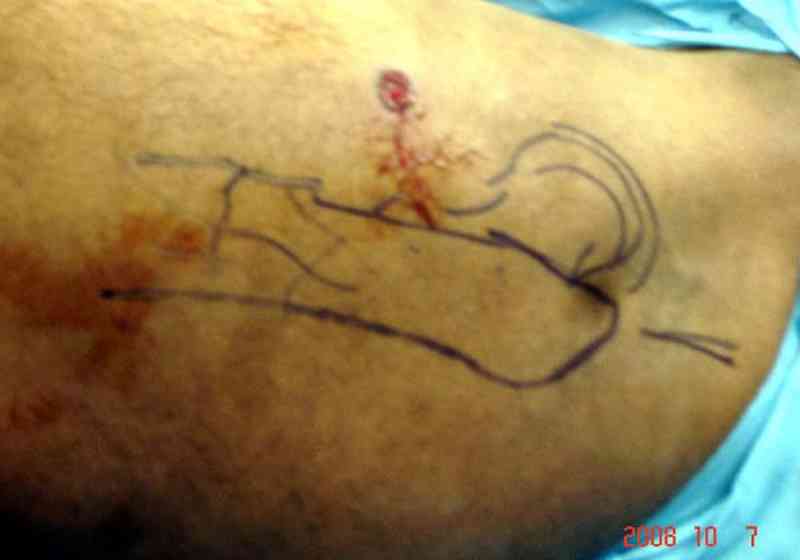 Уважаемый доктор Бен Эльайфар Мохамед. Общепринятая тактика не устраивает меня травматиччностью первичной операции, длительными скроками пребывания больного в стационаре (как минимум до наложения первично отсроченного шва на 7-10 сутки),необходимостью постоянного контроля за промывной системой, сменой постоянно мокнущих повязок, необходимостью постоянного ухода за наложенным аппаратом в течение всего периода фиксации, частым воспалением вокруг спиц и стержней, плохой переносимостью больными АФВ на данном сегменте и рядом других факторов.