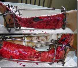 На представленных Вами фотографиях, по моему мнению, у пациента ожоги II-IIIАБ степени. Мне кажется не стоит думать о сращении кости до полного заживления покровных тканей. Позвольте представить наш клинический пример с подобной комбинированной травмой (см. приложение).