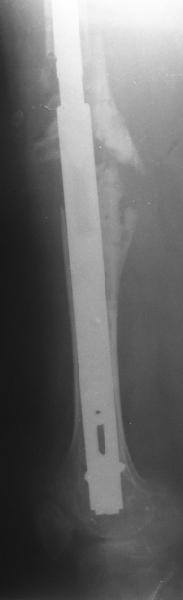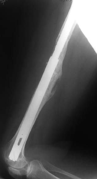 Female, rheumatoid, THA in 2003, car accident in 2006, failed plating. Nailing in Oct 2007. The nail is solid with hollow proximal part where the stem is docked. Last images are in 1 year after
