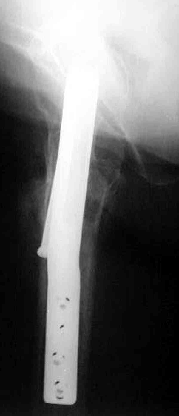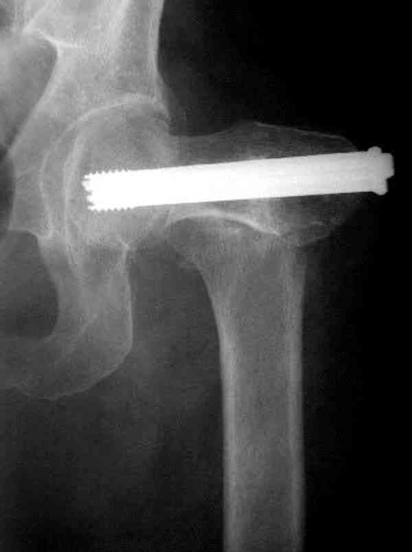 Здесь случай перелома из-за ослабления латерального кортекса через 3 недели после операции на шейке. Шурупы были установлены под большим углом, слабый латеральный кортекс не выдержал нагрузку.