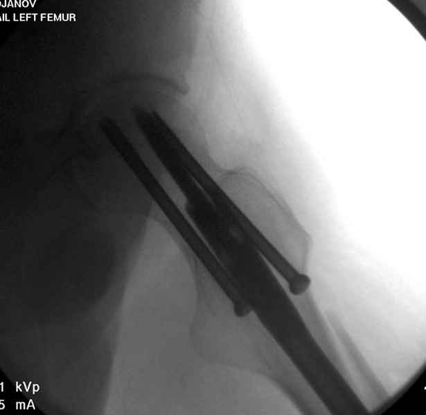 Для профилактики дальнейшего раскола в шейке предварительно во время проксимального рассверливания спереди и сзади провели временные спицы, которые в дальнейшем были заменены на шурупы (miss nail method)