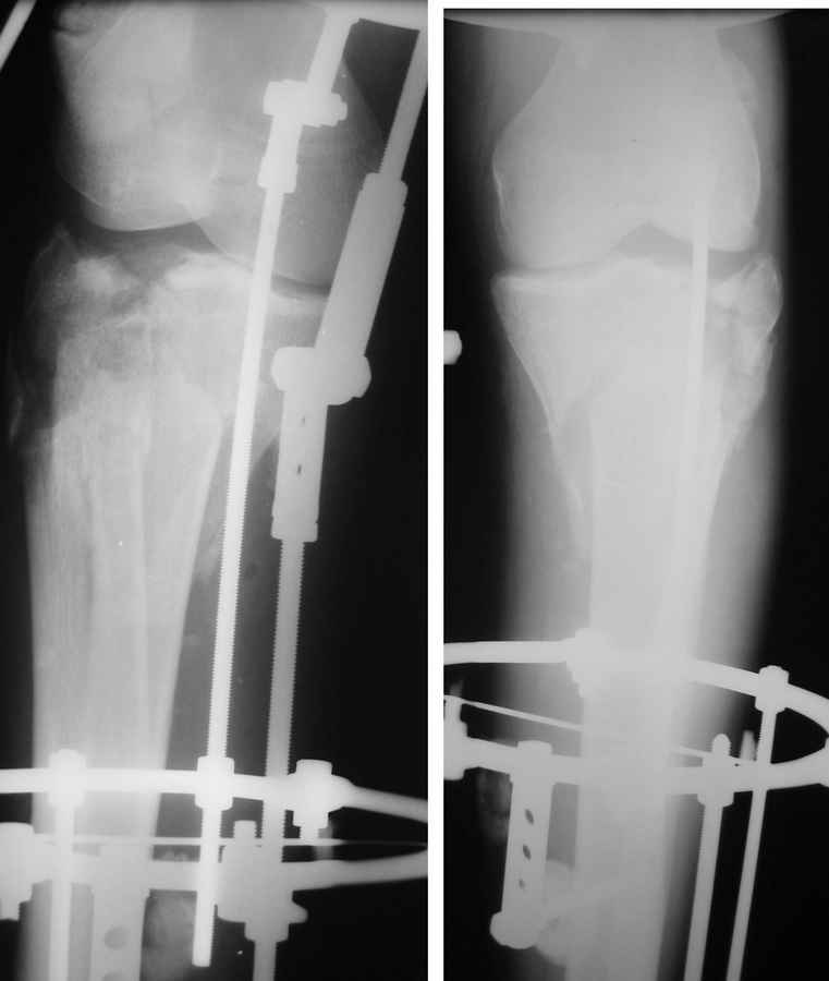 Очаг некроза 4 на 5 см по передней поверхности голени не оставил никакого варианта кроме внешнего остеосинтеза.